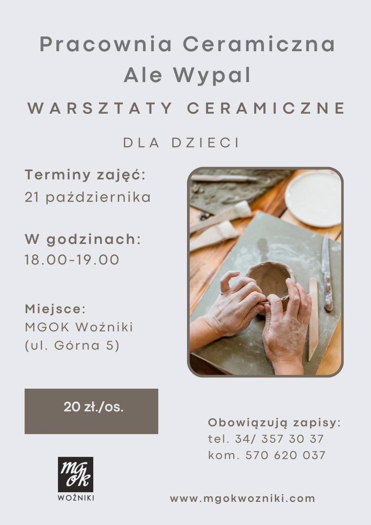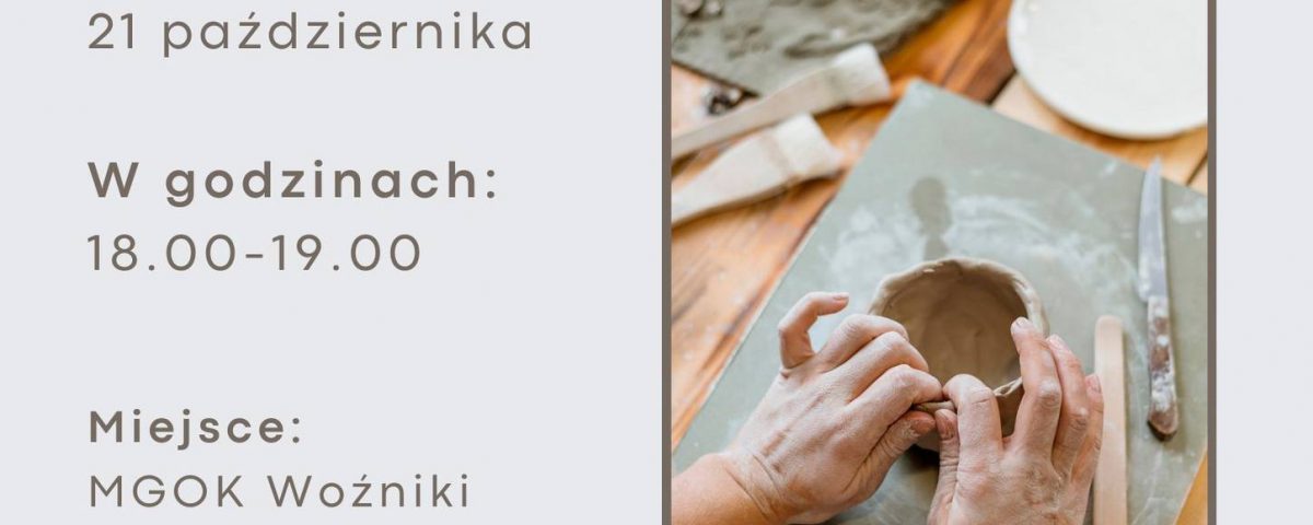 21 października 2025 w godz. 18:00 – 19:00 w pracowni ceramicznej MGOK Woźniki odbędą się warsztaty ceramiczne dla dzieci. Koszt uczestnictwa: 20 zł. Obowiązują zapisy.