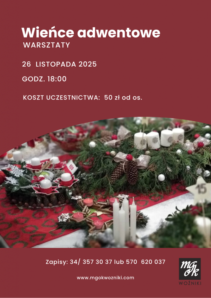 26 listopada 2025 o godz. 18:00 zapraszamy do Miejsko-Gminnego Ośrodka Kultury w Woźnikach na warsztaty tworzenia wieńców adwentowych. Koszt uczestnictwa: 50 zł od os. Obowiązują zapisy. Organizator zapewnia wszystkie niezbędne do wykonania wieńców materiały. Dodatkowe informacje i zapisy: 34/357 30 37 lub 570 620 037.